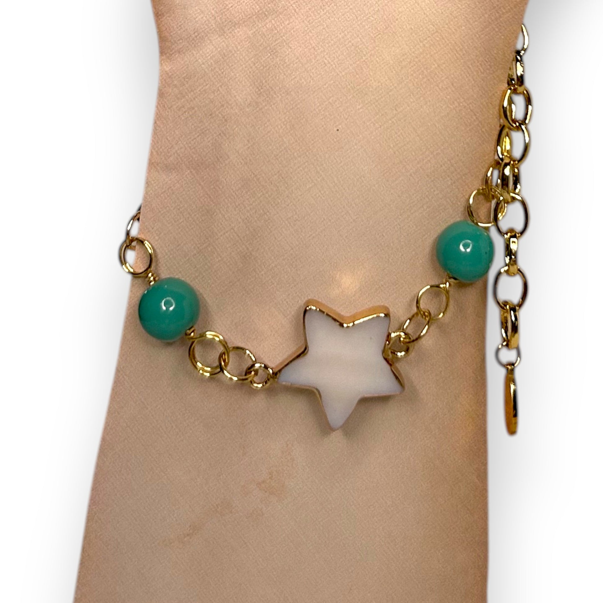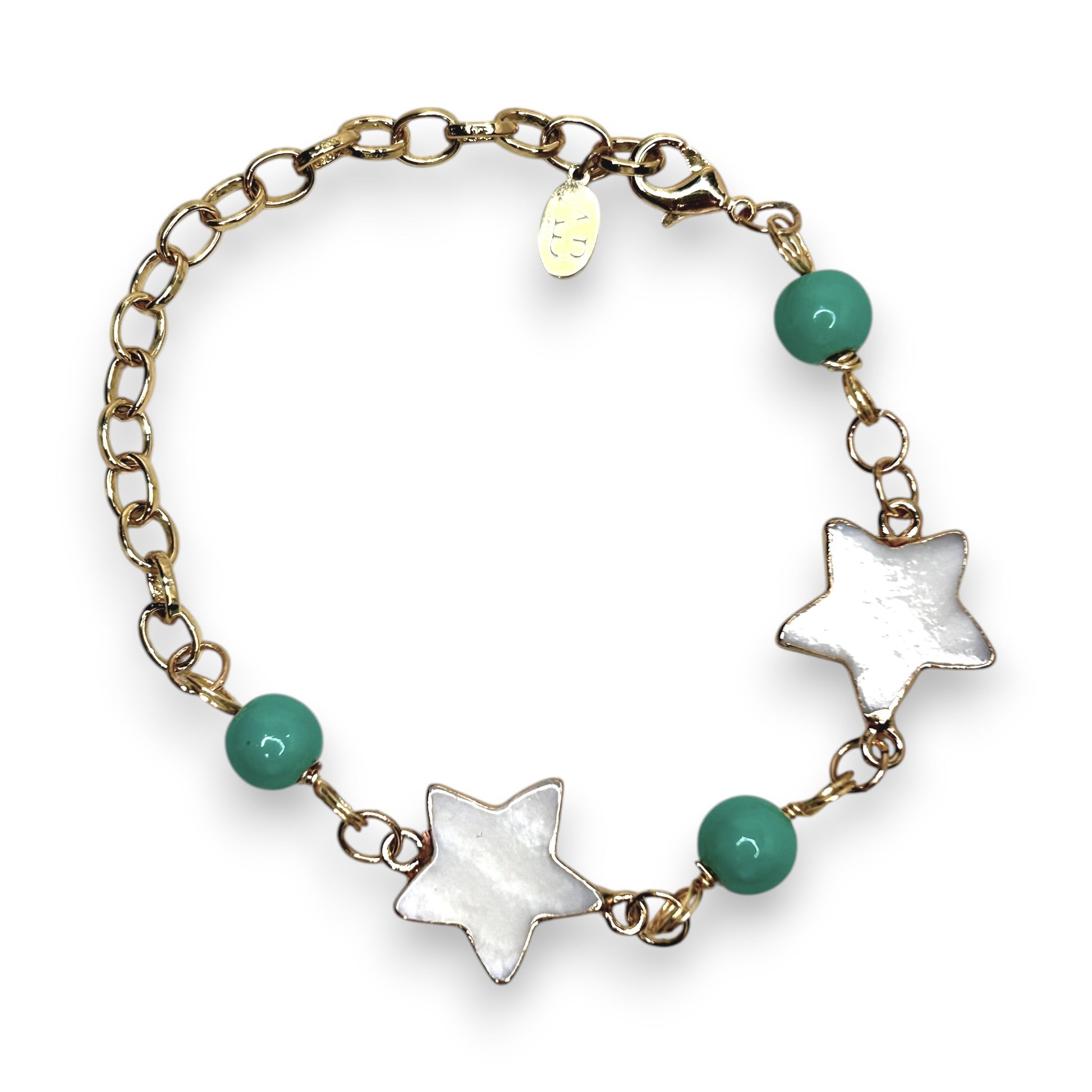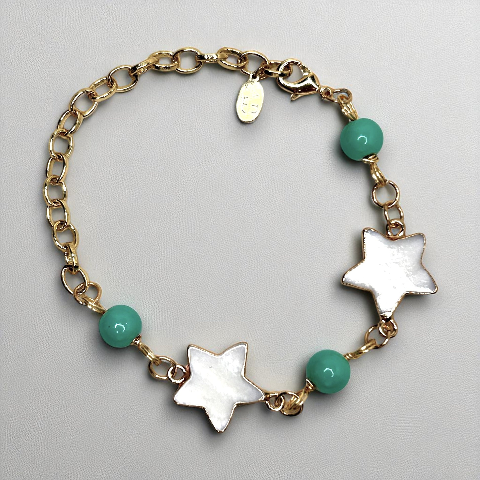 La pulsera "Luz de Promesa" nace de un recuerdo profundo: las estrellas nacaradas representan esas promesas silenciosas que sostienen el alma, mientras las cuentas verdes simbolizan la fe que brota incluso en las tierras más heridas. Su cadena dorada actúa como un vínculo invisible entre lo divino y lo cotidiano, entre los sueños y la realidad. Este delicado accesorio es un recordatorio poderoso de la esperanza y la conexión espiritual que nos guía en cada paso. Lleva contigo esta luz que une lo intangible con tu vida diaria.